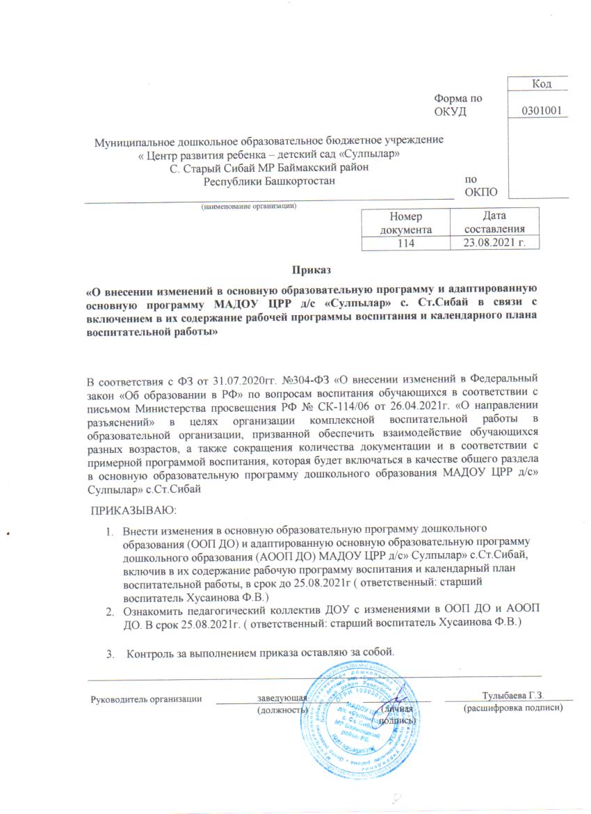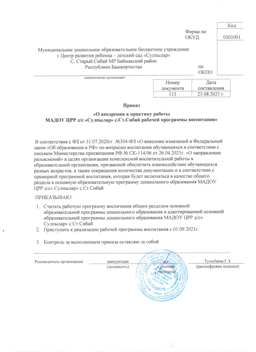 Рабочая программа воспитания (далее - Программа) определяет содержание и организацию воспитательной работы Муниципального автономного дошкольного образовательного учреждения центр развития ребенка «Сулпылар» села Старый Сибай муниципального района Баймакский район Республики Башкортостан (далее – ДОО). Рабочая программа воспитания разработана коллективом учреждения на основе требований Федерального закона от 31 июля 2020 г. № 304-ФЗ «О внесении изменений в Федеральный закон «Об образовании в Российской Федерации» по вопросам воспитания обучающихся» с учетом Плана мероприятий по реализации в 2021–2025 годах, Стратегии развития воспитания в Российской Федерации на период до 2025 года, федерального государственного образовательного стандарта дошкольного образования.